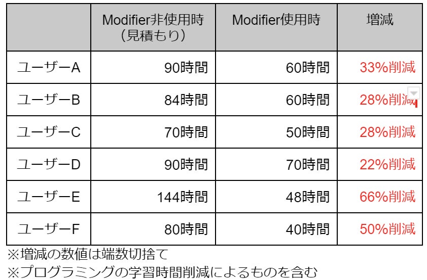 ・XRコンテンツ制作実証実験におけるModifier使用時と非使用時(従来ワークフローでの見積もり)の作業時間の変化