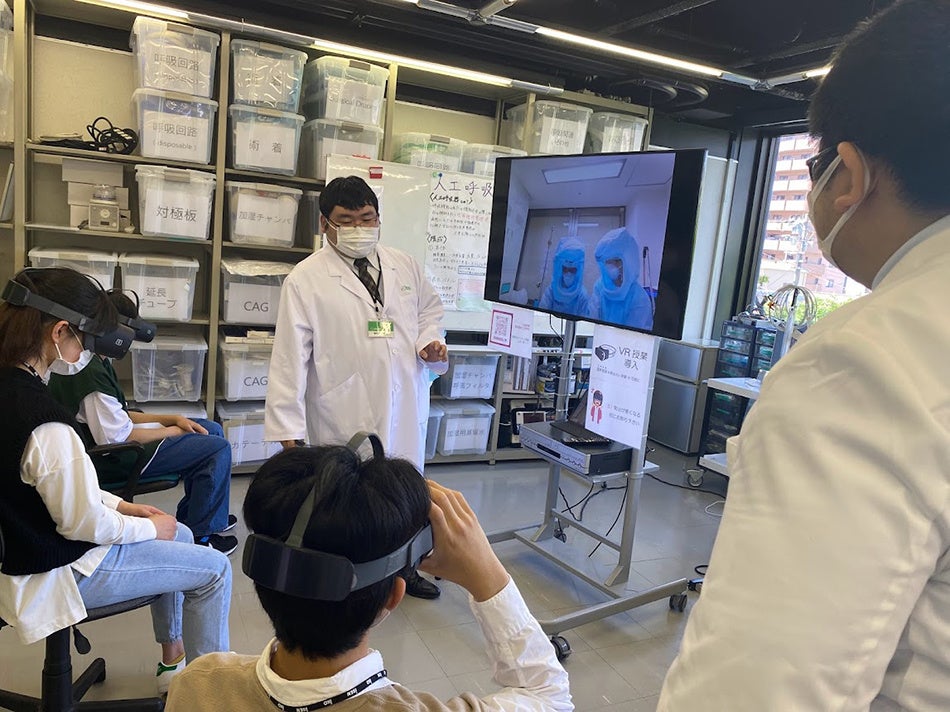 体験入学では、参加者にVRゴーグルを装着してもらい、ICU(集中治療室)の現場を体感してもらいます。教官は大型TVに同じ内容を映しながら、参加者へ解説をしていきます。
