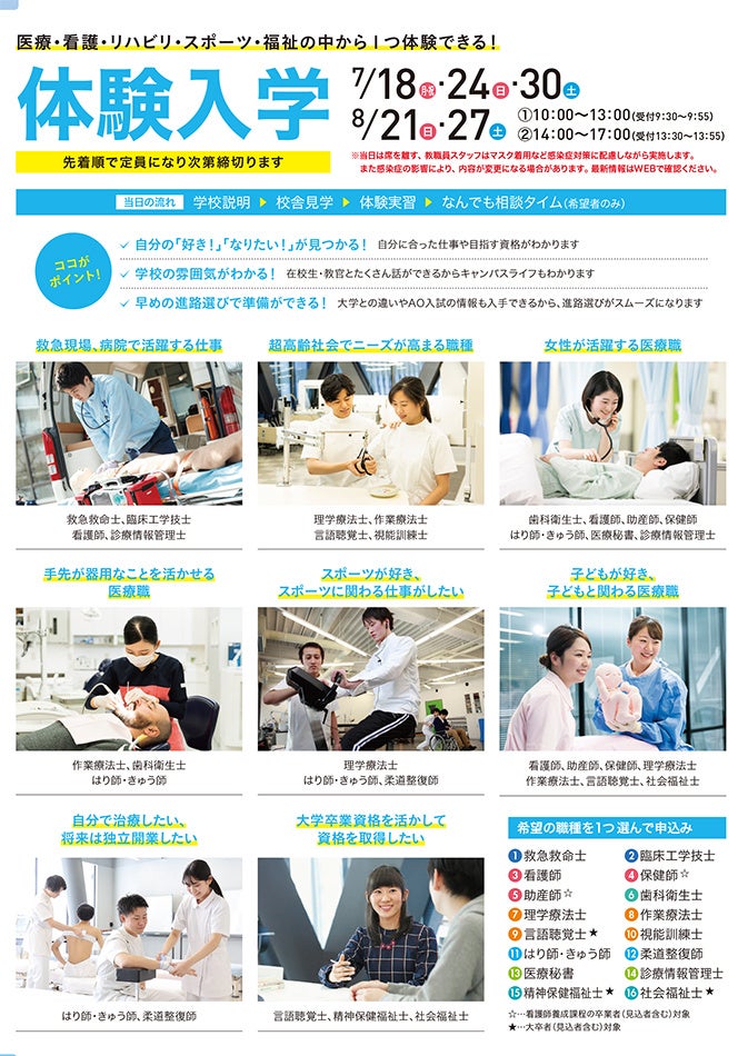 名古屋医専では、毎月体験入学を開催しています。7月は24(日)・30(土)を予定しています。見学・相談は毎日(10:00〜20:00※日曜・祝日を除く)、オンラインでも対応しています。