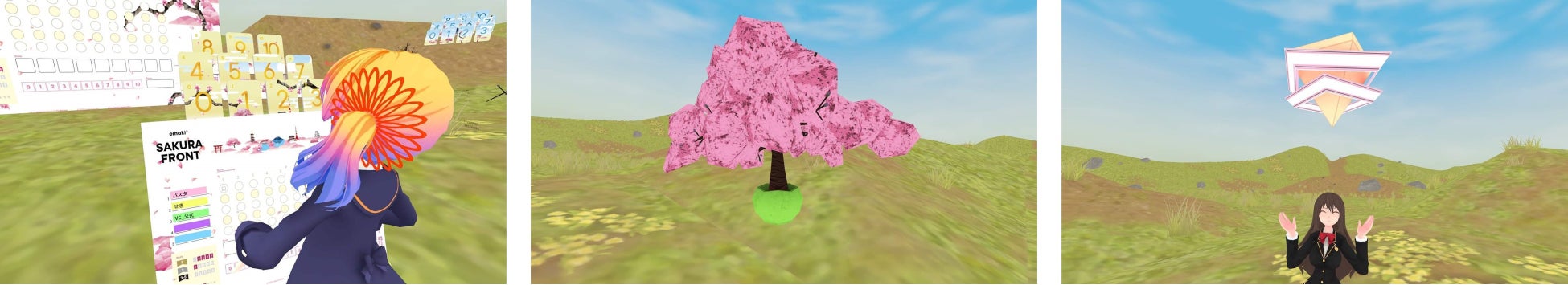 今回、開発元の「JUGAME STUDIO」による全面協力のもと作成した『SAKURA FRONT VR』は、メタバースコミュニケーションサービス「バーチャルキャスト」内でも遊びやすいように操作方法を変更し、獲得した得点に応じて自分の桜の花が大きく咲いていく演出、アバターの頭上にターンプレイヤーを示すマーカーの出現など、VRならではの演出を追加したものになります。