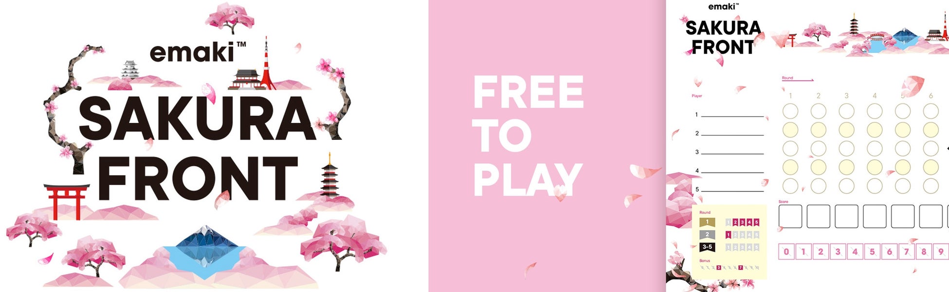 『SAKURA FRONT』は、美しい桜のイラストが描かれた5種類のカード計55枚で遊ぶカードゲームです。プレイヤーは0から10の数字が割り当てられたカードを使い、全9回の花見の開花状況をそれぞれ予想していきます。各数字のカードを使えるのは一度きり、最も大きな数字のカードを出したプレイヤーは他のプレイヤーの出したカードを得点として獲得できるなど、手札を読み合う心理戦が楽しめます。