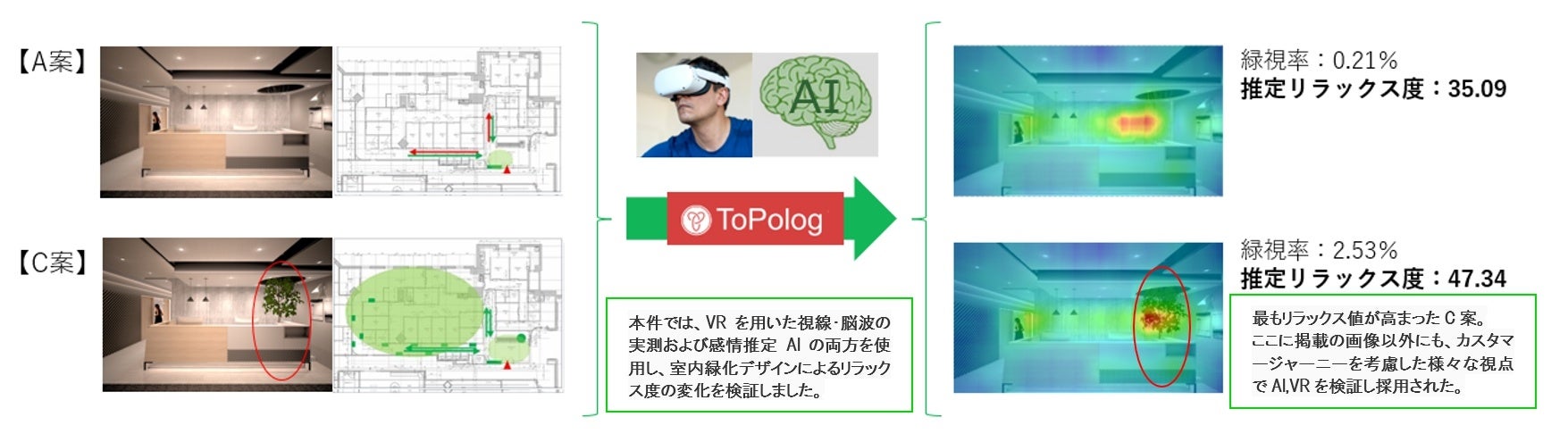 ジオクリエイツでは、約2,000人分の視線や脳波の実測データを蓄積しており、建築設計業務において設計者や事業主の経験則等で判断されることが多い空間体験の価値を定量化する技術を有しています。本件では、画像解析から、緑視率(人の視界に占める緑の割合で、緑の多さを表す指標)に応じて推定される脳波のα波に由来したリラックス度を0-100の値で推定する感情推定AIを室内緑化デザインに用い、採用されました。
