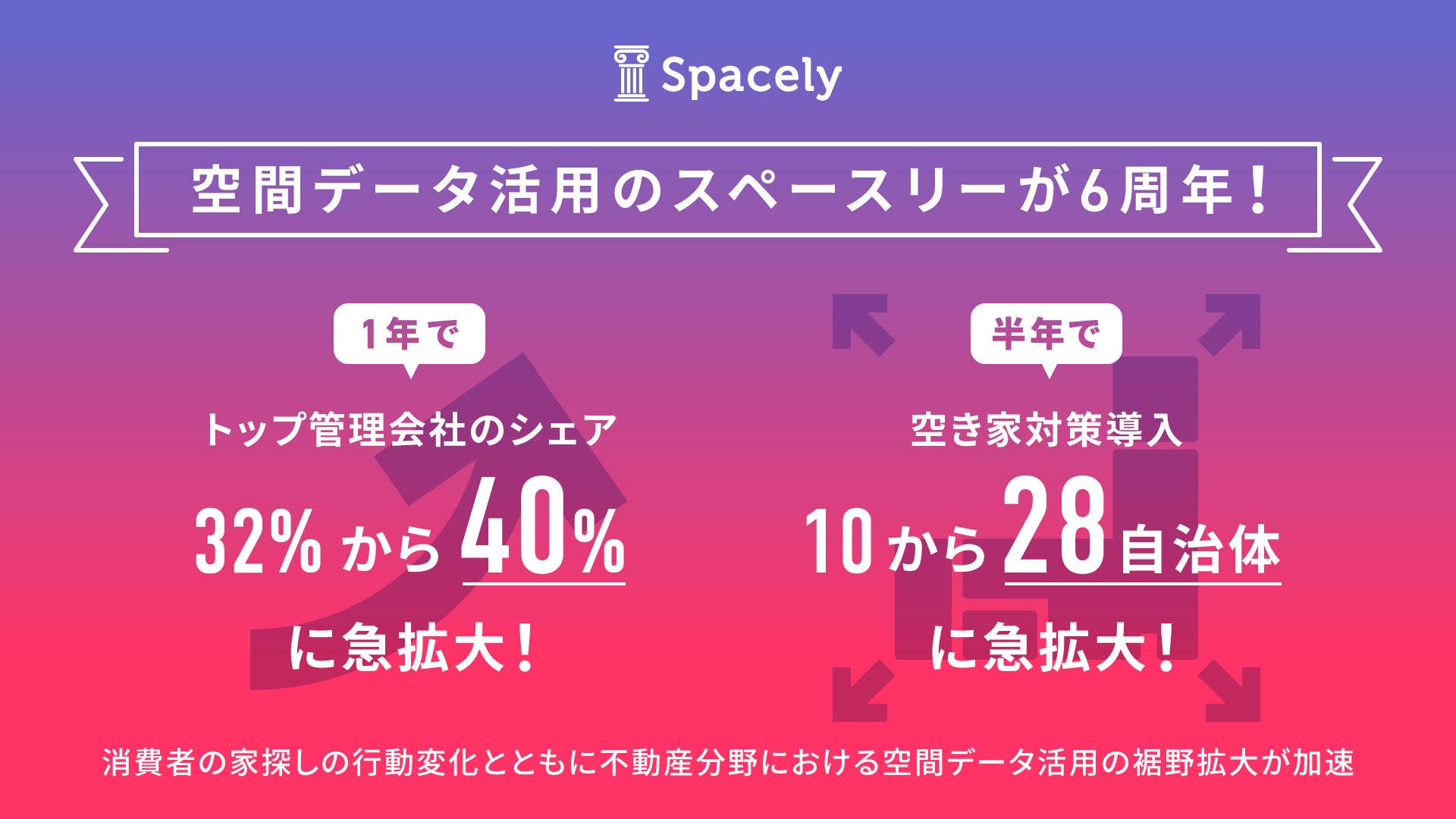 空間データ(*1)活用プラットフォーム「スペースリー」を提供する株式会社スペースリー(本社:東京都渋谷区、代表取締役:森田 博和、以下:当社)は、2022年11月2日でサービス開始から6周年を迎えました。直近の1年間で、全国トップ100の不動産賃貸管理会社のシェアが32%から40%に急拡大、また、地方自治体での空家対策のための導入が本年4月時点の10自治体から、約半年した本日時点で28自治体と約3倍に拡大しました。消費者の家探しの行動変化とともに不動産分野における空間データ活用の裾野拡大が一層加速しています。