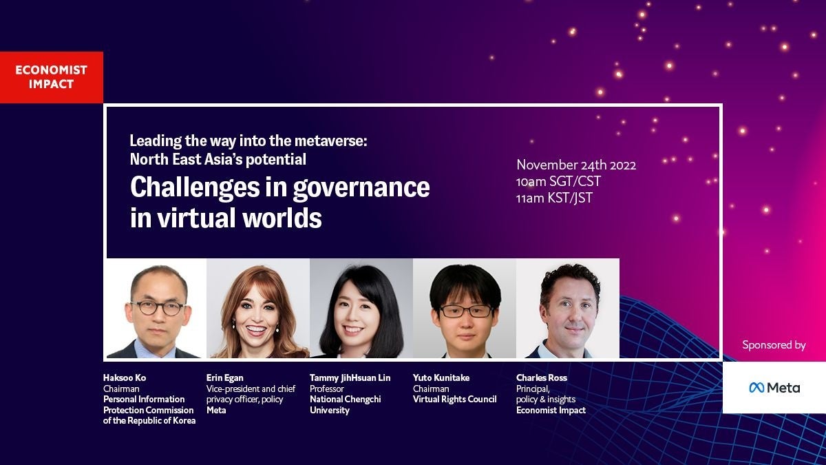 Economist Impact は11月24日に「Challenges in governance in virtual worlds/仮想世界におけるガバナンスの課題(Sponsored by Meta)」セミナーを開催することを決定いたしました。Meta米国本社 副社長兼最高プライバシー責任者、大韓民国個人情報保護委員会 委員長、台湾国立政治大学 教授、NPO法人バーチャルライツ 理事長、Economist Impact プリシンパルが登壇し、仮想世界のプライバシー、安全性、完全性に対するベストプラクティスと原則に基づくアプローチを開発するために、利害関係者がどのように協力できるか議論します。