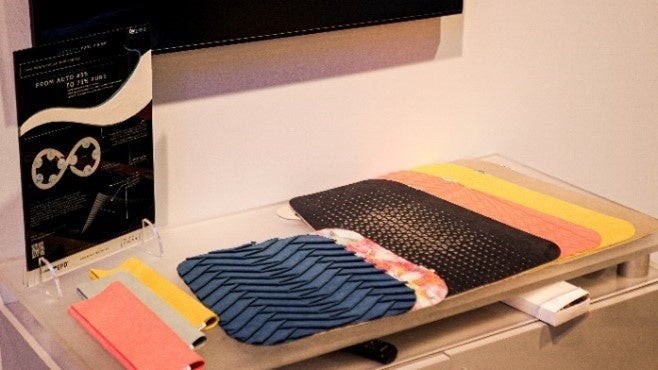 自動車内装材に多く採用されている人工皮革製品の新ラインナップ「PURE」を展示しました。リサイクル率は既存製品の「AUTO」の45%から「PURE」では73%になりました。外観と性能を変えずに、リサイクル材の使用量を高めています。