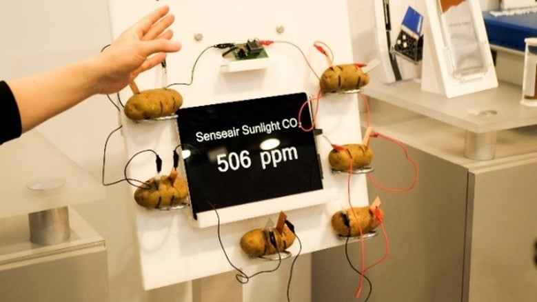 本CO2センサーは超低電力でも動作するのが特徴です。今回はじゃがいも6個分から得られる微小な電力からCO2を測定するデモを行いました。