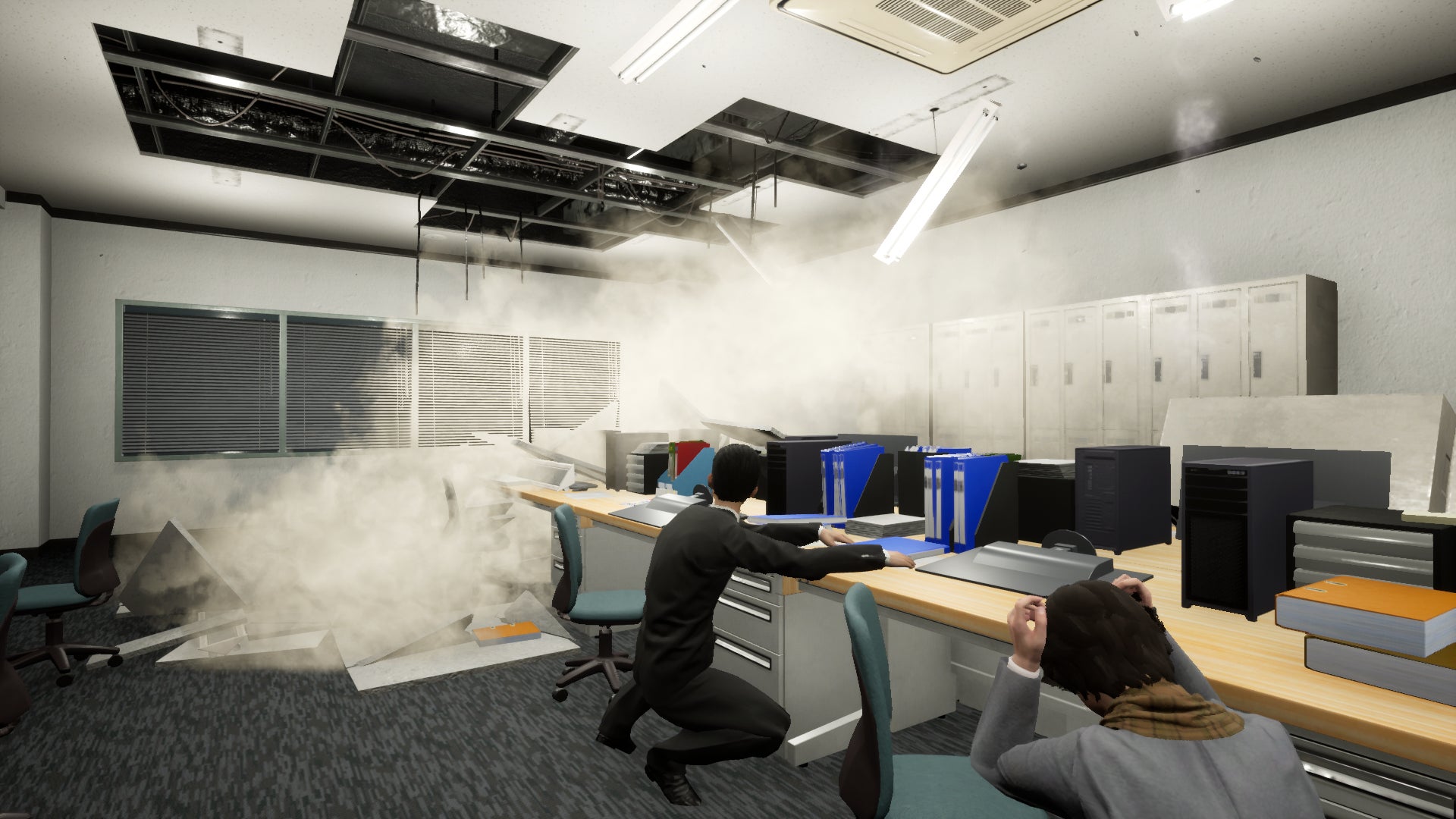 「火災臨場体験VR~混乱のオフィス~」は、災害の危険性や怖さを“自分事”と捉えてもらい、防災教育や防災訓練に対する意欲向上を目指して制作したもので、オフィスビルでの火災や大地震の恐怖と、それを目の当たりにした人々の混乱の様子を、プレイヤー自身もその空間内にいる“ひとり”になってリアルに体験することができます。