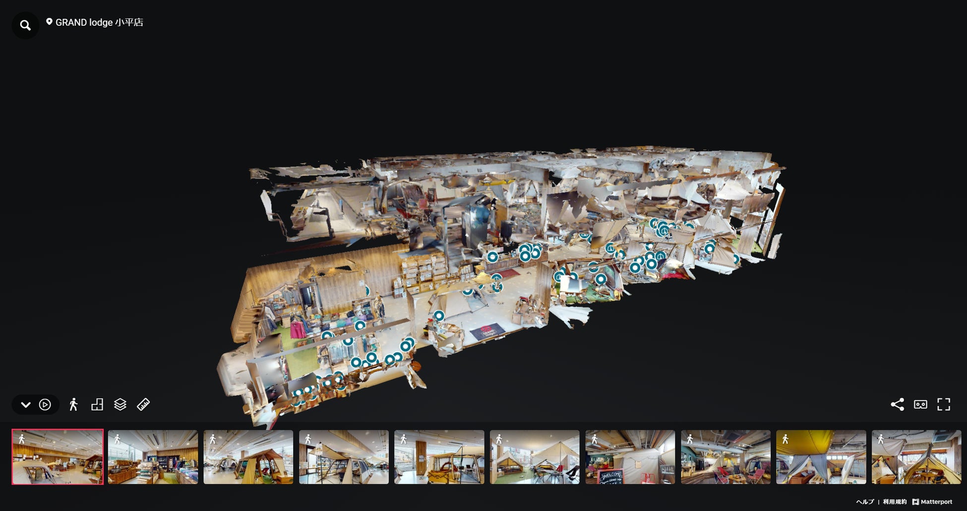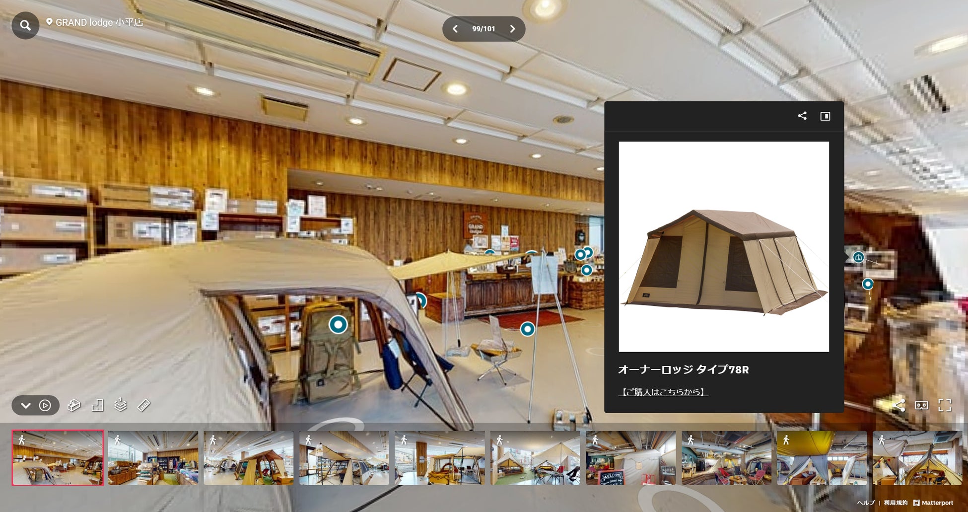 VR店舗では、実店舗をMatterportで撮影することでインターネット上に「GRAND lodge 小平店」を完全再現し、100個以上のリンクを埋め込むことで、消費者が実店舗に出向くことなくバーチャル空間で買い物体験ができるようになります。店舗内の様子を見るだけでなく、展示されているテントの設営方法の動画再生や、商品のオンラインショッピングがその場でできるなど、ウェブサイトのもつ利便性も兼ね備えております。
