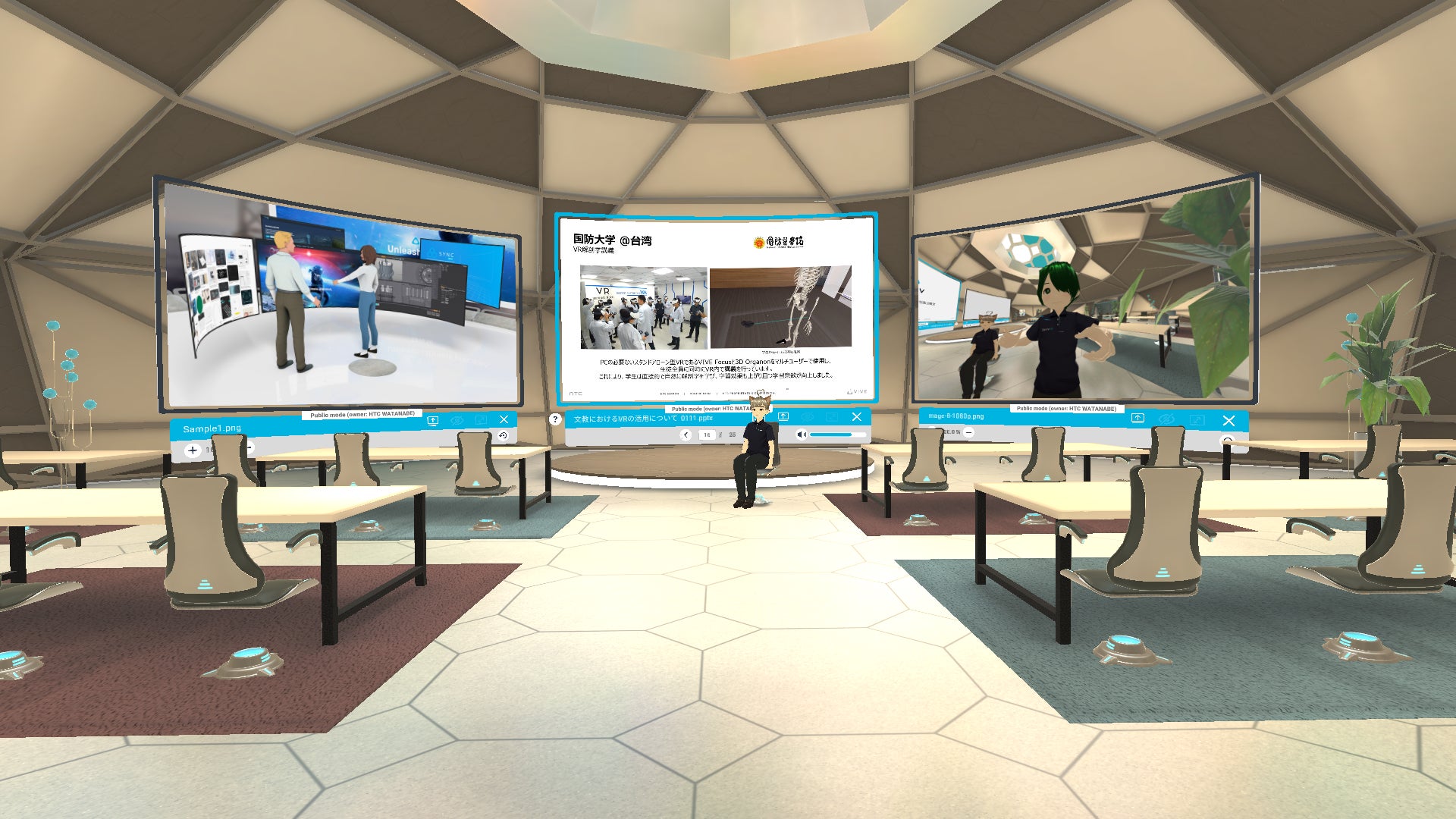 HTCが提供するVR会議ツール「VIVE Sync」やメタバースプラットフォーム「VIVERSE」で、大中小の会議スペースにVIVE AvatarやVRM対応のアバターツールで作成したキャラクターで参加できる空間を展示いたしました。