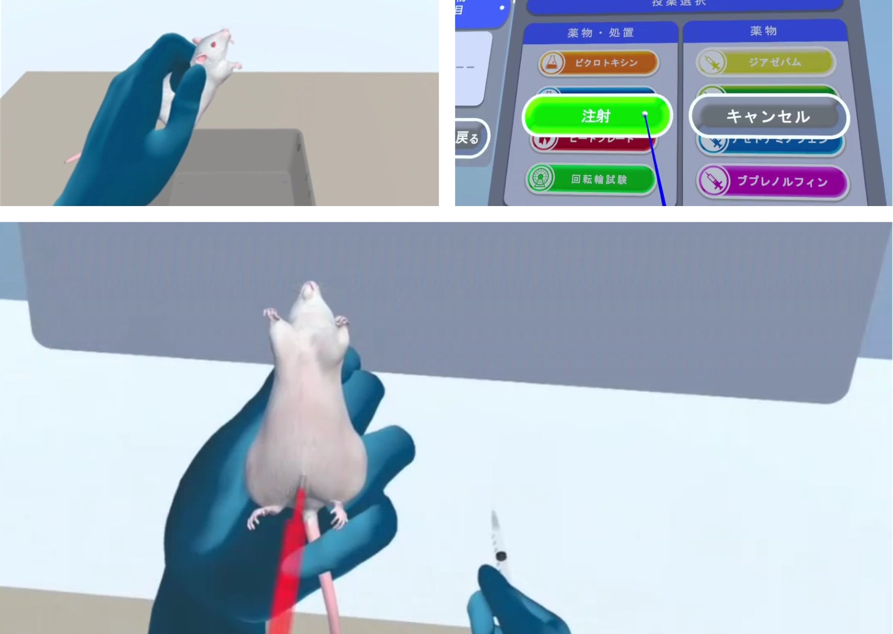 本製品は、実験用マウスに各種の薬物を投与したり、処置を行ったりする際の動物の反応を、VR (Virtual Reality -仮想現実- ) コンテンツで表現することにより、薬理学実習を動物を使うことなく体験できるシステムです。専用ソフトウェアがインストールされた VR ゴーグル(Meta Quest)を装着し、学生さん自らがその場にいるかのような空間を体験しながら、仮想空間上で実験用マウスに薬剤投与や処置を行います。本製品を活用することで、学生さんは各自が与えられた学習課題をどのようにして解決できるのかを試行錯誤しながら行っていく、いわゆるアクティブ・ラーニングを経験しながら実習を行うことができます。
