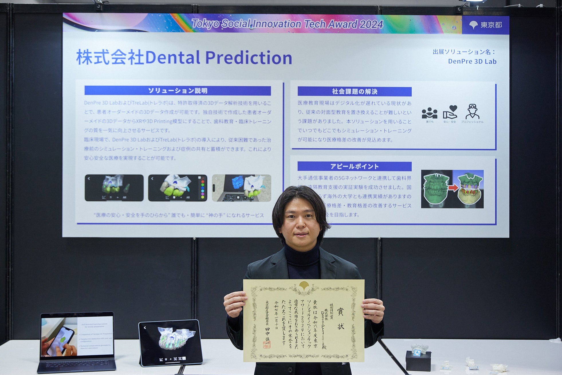 | 株式会社Dental Prediction(所在地:東京都港区、代表取締役:宇野澤元春、以下「Dental Prediction」)が開発・提供している歯科3Dデータ制作サービス「DenPre 3D Lab」が、東京都主催の「Tokyo Social Innovation Tech Award 2024」にて、技術特別賞を受賞しました。 「Tokyo Social Innovation Tech Award 2024」は、東京都が抱える社会課題解決の加速化を目指す先端技術(AI、XR、メタバース等)を活用したソリューションやコンテンツを表彰するアワードです。「DenPre 3D Lab」は、特許取得済の3Dデータ解析技術を用いて患者オーダーメイドの3Dデータを作成するサービスであり、安心安全な医療の実現につながる社会的価値と歯科業界のイノベーション性が評価され、今回の受賞に至りました。 ■代表取締役 宇野澤元春(歯科医師、医学博士)コメント ![]() この度は、このような素晴らしい賞を受賞させていただき、誠にありがとうございました。 現在、歯科業界はアナログからデジタルへの変革期であると考えており、今回の受賞を皮切りにデジタルで安心安全な歯科医療の実現を目指していきたいと思います。 今回の受賞にあたり、弊社サービスをご愛用していただいている歯科医院の先生方に感謝を申し上げます。 ■「DenPre 3D Lab」について DenPre 3D LabおよびTreLab(トレラボ)は、特許取得済の3Dデータ解析技術を用いることで、患者オーダーメイドの3Dデータ作成が可能な歯科シミュレーションツールです。独自技術で作成した患者オーダーメイドの3DデータからXRや3D Printing模型にすることで、歯科教育・臨床トレーニングの質を向上させることが可能です。 ![]() ![]() ![]() 詳細・お問い合わせ:https://www.denpre.co.jp/services/service1/ ■歯科業界における社会課題の解決 医療教育現場はデジタル化が遅れている現状があり、特に現役の歯科医師の教育・トレーニングは“現場での実際の診療”に大きく依存せざるを得ず、従来の対面型教育を置き換えることが難しいという課題がありました。臨床現場でDenPre 3D LabおよびTreLab(トレラボ)を導入することで、「診察における患者への説明」と「歯科医師の治療技術トレーニング」に3D データ模型や XR(VR・AR・MR)を用いることで、いつでもどこでもシミュレーション・トレーニングおよび症例の共有と蓄積が可能になります。歯科医療教育の質を向上させることで、安心な医療体制の実現・医療格差の改善を目指しています。 ■「Tokyo Social Innovation Tech Award 2024」について 東京都が主催するAI、XR、メタバースを含む最先端技術を活用して社会課題を解決し、新たな価値を提供する製品やサービスを表彰するプログラムです。受賞者には、サービスの普及や今後の事業展開における支援が提供されます。 https://tsi-tech-award.metro.tokyo.lg.jp ■Dental Prediction について 世界中の人々が、どこにいても最新の歯科教育・相談・治療にアクセスすることのできるデジタルプラットフォームを提供しています。デジタル技術を活用し、国民の健康寿命の延伸および健康格差のない社会の実現を目指しています。 今後控えている大規模なプロジェクトに向け、一緒に働いてくれる仲間を募集しています Dental Predictionの事業内容にご興味を持っていただいた方や、企業理念やビジョン・ミッション・バリューに共感していただける方など、様々なポジションで採用を行っていますのでお気軽にお問い合わせください。 https://recruit.denpre.co.jp/Dental-Prediction-b7617eca62ee4945b019268cfa53f6aa <会社概要> 社 名:株式会社Dental Prediction 所在地:東京都港区虎ノ門1-17-1 虎ノ門ヒルズビジネスタワー15F 設 立:2020年6月17日 代表者:代表取締役 宇野澤 元春(歯科医師、医学博士) 事 業:「歯科の健康相談 mamoru」アプリや歯科3Dデータ制作サービス「DenPre 3D Lab」を展開 公式サイト:https://www.denpre.co.jp/ ※掲載の商品名称やサービス名称などは、一般に各社の商標または登録商標です。 ※各社の商標記載においては、(TM)や(R)などの商標表示を省略する場合があります。 |