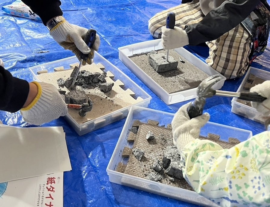 ブロックを砕いて化石(アンモナイト)を掘り出すリアルな発掘体験を実施いたします。出てきた化石はその場で参加者にプレゼントいたします。 |