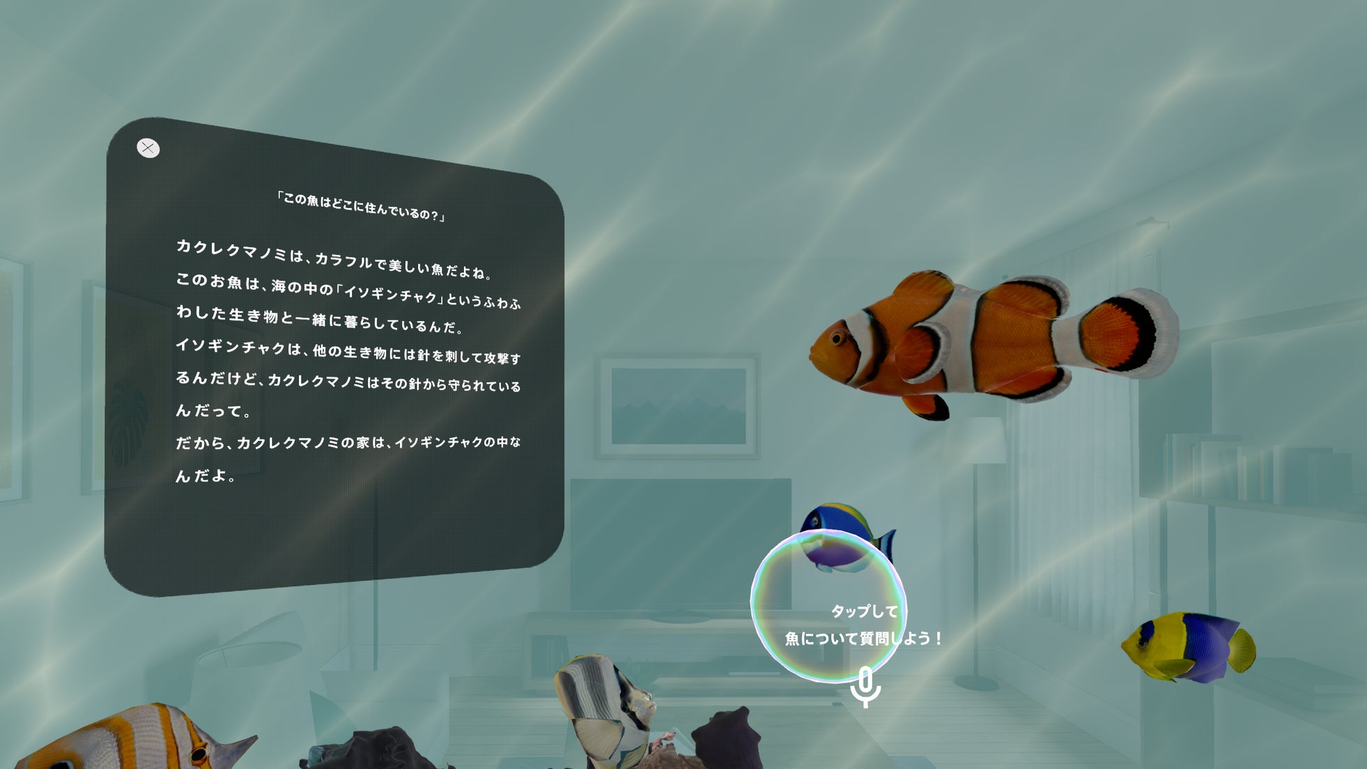 | このコンテンツには生成AIが組み込まれており、魚をタップして音声で魚について質問すると、AIが質問に答えます。 |