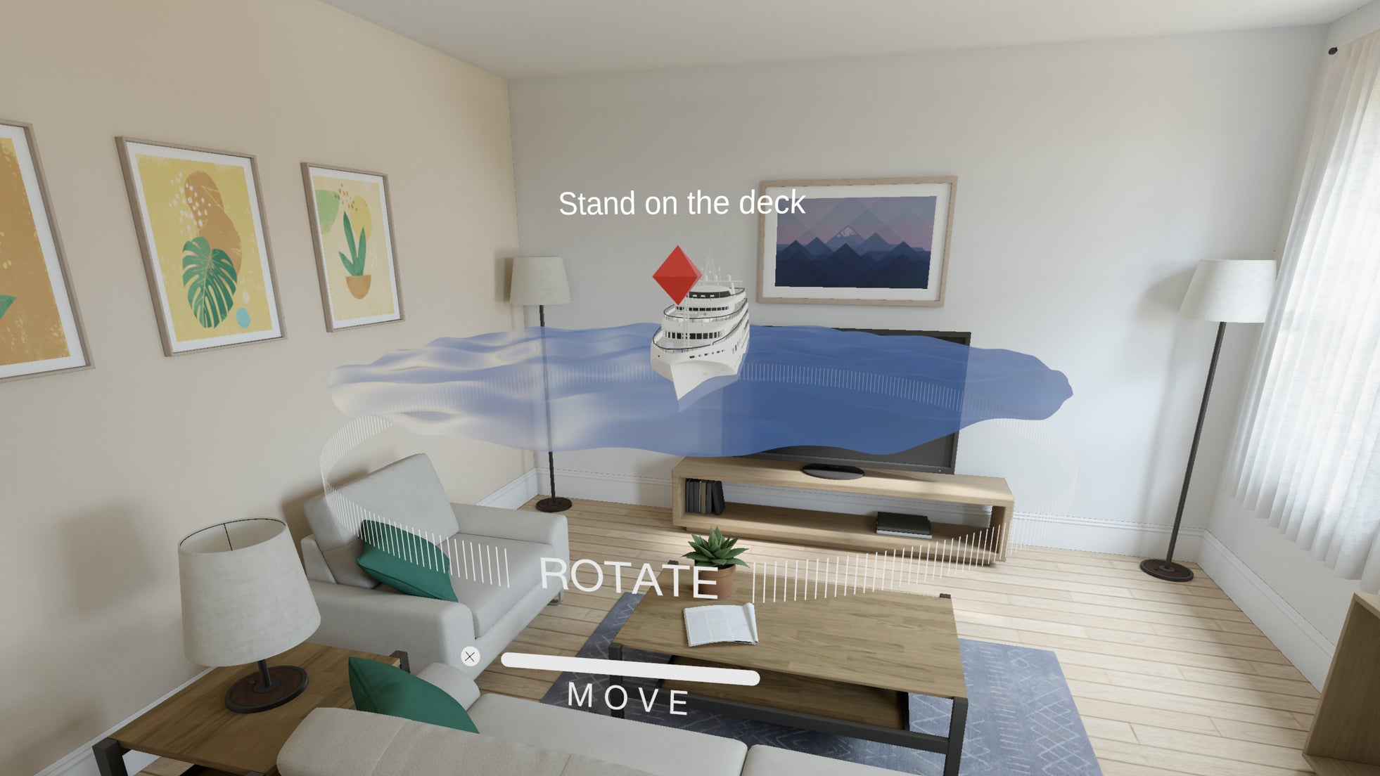 | アプリ内のクリスタルをタップすることで船のデッキの上に立つことができ、海の上の世界に没入することができます。 |