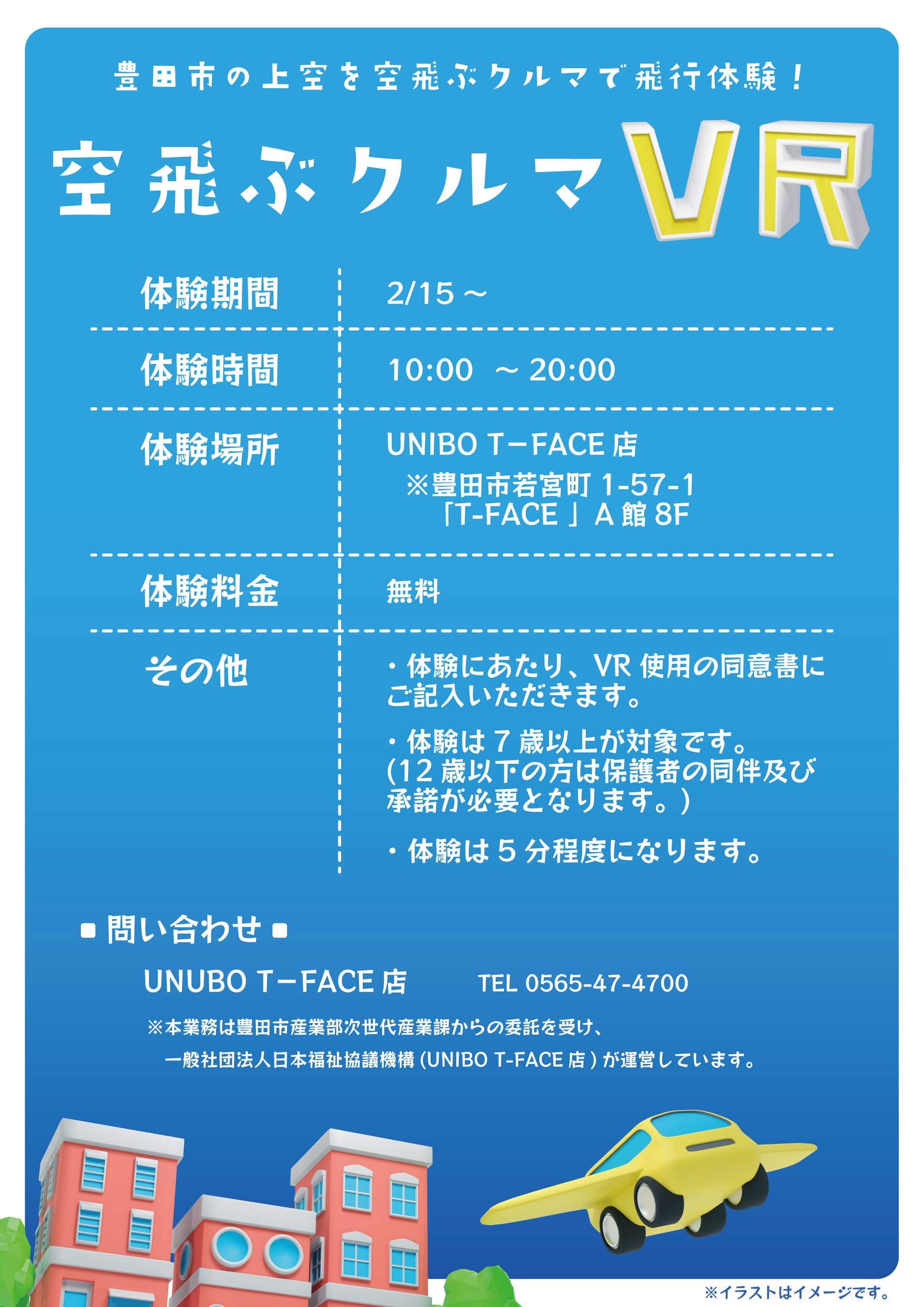 | 豊田市では、「豊田市次世代航空モビリティ協業ネットワーク」の取組の一環として、「空飛ぶクルマ」の普及啓発を目的に、仮想空間上で「空飛ぶクルマ」の飛行体験ができるイベントをこれまで行ってきました。多くの方々に体験していただきましたが、豊田市民を中心により多くの方々に次世代の技術に触れていただきたいという想いを持たれており、この度、弊社が運営しているデジタルアミューズメントフィールド【UNIBO 豊田t-face店】にて、無料の体験コーナーを展開させていただくことになりました。ご興味のある方は、ぜひUNIBO 豊田t-face店までお越しください! |